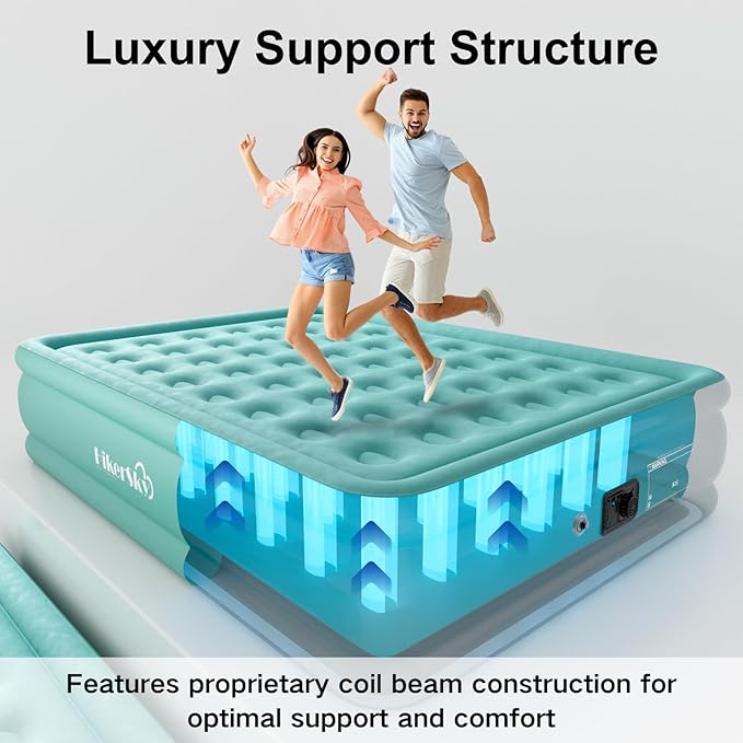• QUICK SELF INFLATING: The queen air mattress has a built-in pump with dual air chambers, dual air chambers work simultaneously. It only takes 3 minutes to inflate and deflate.