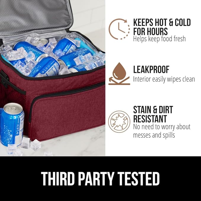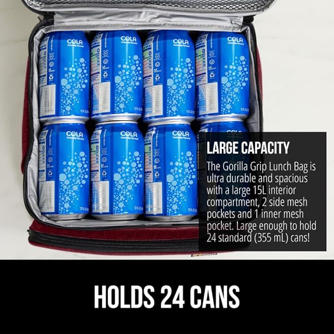 GORILLA GRIP Reusable Insulated Lunch Box Bag for Women Men, XL 15L, Leakproof Soft Cooler Bags, Multiple Compartments, Mesh Pockets and Adjustable Strap, Food Tote Keeps Drinks Cold, 13x9, Burgundy