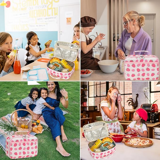 • It's super popular and very classy with beautiful strawberry pattern,The lunchbox bag is leak-proof and friendly to carry on. The bag is suitable perfect for kids, children, girls to school, women to work. You will love to bring this adorable insulated lunch box to school everyday!
