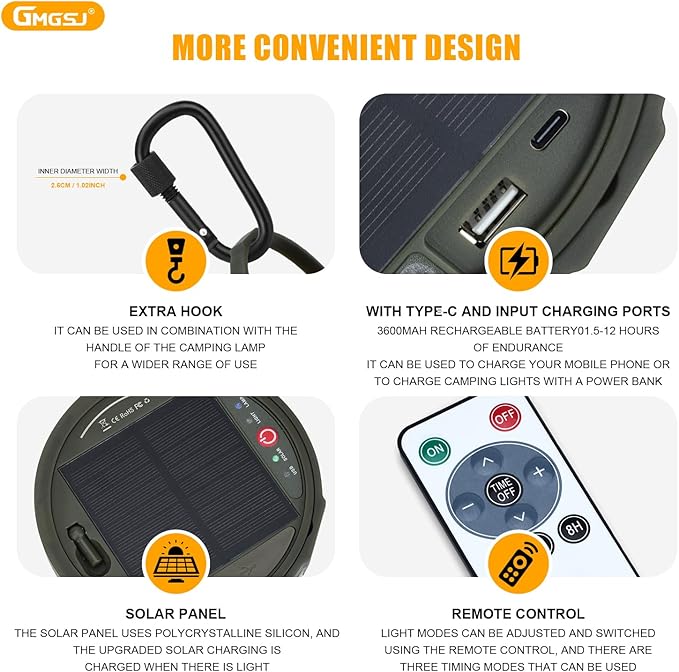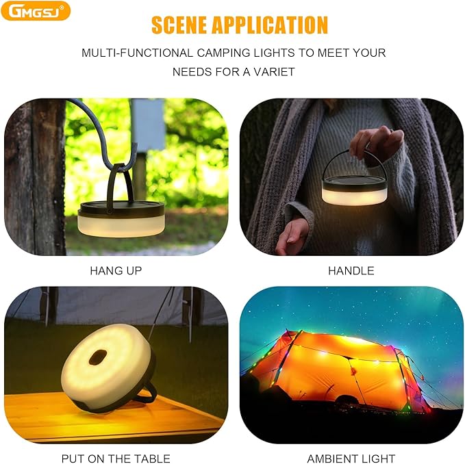 • MULTI-FUNCTIONAL SOLAR CAMPING LIGHT:GMGSJ camping light is a combination of lantern and string light, built-in 150 warm white LEDs, emitting warm and soft light, like scattered stars, illuminating your tent and exuding a warm and romantic atmosphere, it is a must-have for summer vacation camping