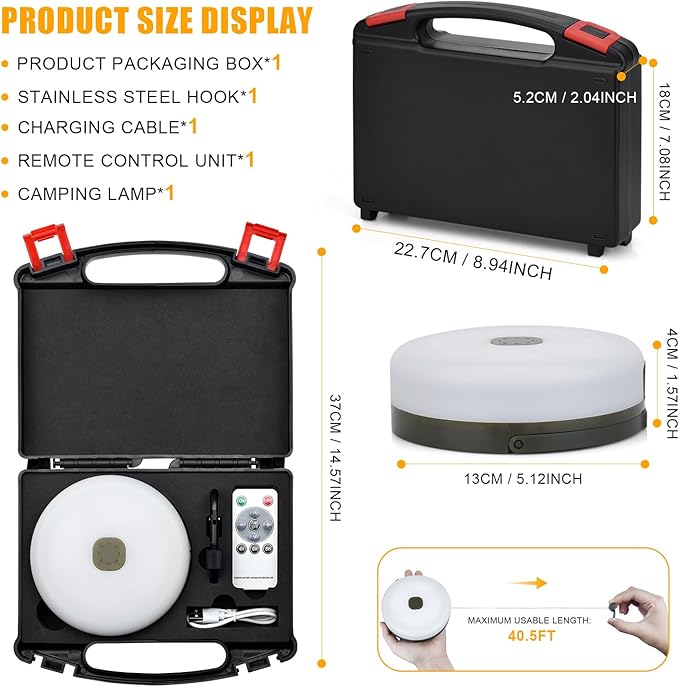 • CUSTOMIZED STORAGE CASE: Black organizer box with dedicated compartments securely holds the light, USB-C cable, remote control, and D-ring clips; Prevents tangling or damage during transport while keeping accessories instantly accessible for camping trips or emergency kits