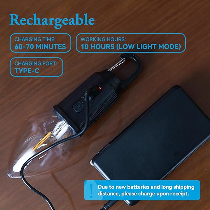 • Quick Charge and Long-Lasting:Our battery powered lantern features a rechargeable battery,eliminating the need for replacements and saving you money.Using a Type-C charging cable,it fully charges in just 60-70 minutes.On the lowest brightness,it lasts up to 10 hours,and up to 8 hours on the highest brightness.Ideal for outdoor battery operated lights and battery operated light bulb, Our battery operated lights outdoor offers both efficiency and convenience,Ideal for outdoor use