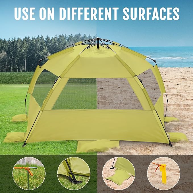 • Easy Set Up with Stability Accessories & Easy to Carry - Quick popping mechanism allows to set up in seconds! Includes 5 attached sandbags, 6 steel stakes, 6 sand stakes & tiedown strings to provide more stability; lightweight and easy to fold back with a compact carrying bag for easy transport and storage.