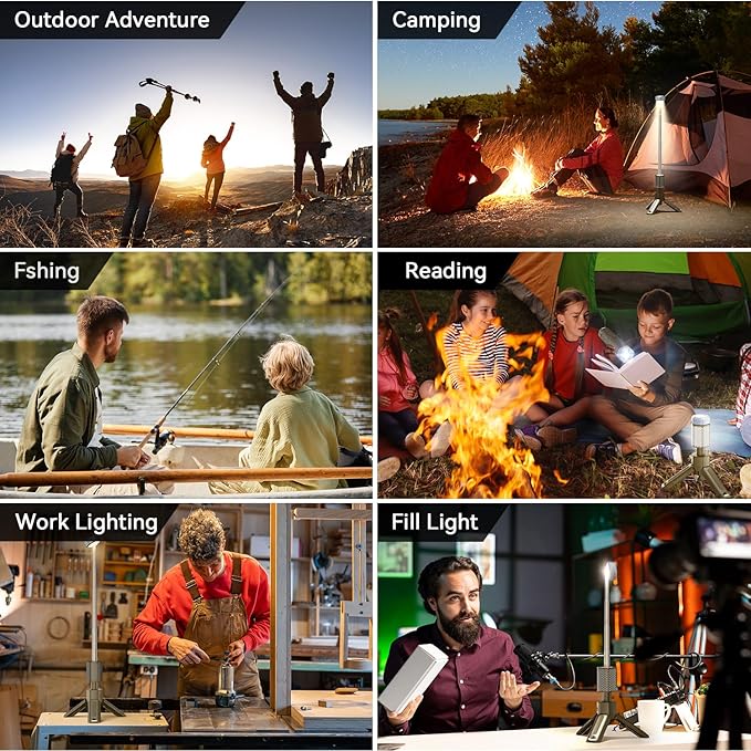 • Portable and Easy to Use: Featuring a retractable, foldable, and magnetic tripod design, our camping light is incredibly easy to carry and store, ideal for limited space in camping backpacks. The extendable lamp pole can illuminate hard-to-reach areas like tent tops or narrow corners. The tripod can stand stably on flat ground, grass, or sand, and the built-in magnet allows it to attach securely to cars, boats, or motorcycles