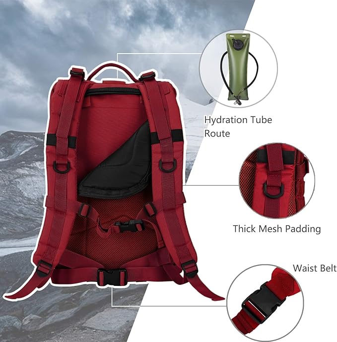 • COMFORTABLE & TOUGH - The shoulder straps are padded and adjustable and the waist belt expands enough. The thick mesh padding back area and shoulder straps will not pinch you under heavy duty. Thick padded back panel pocket works great with 3L hydration bladder(hydration bladder do not include)