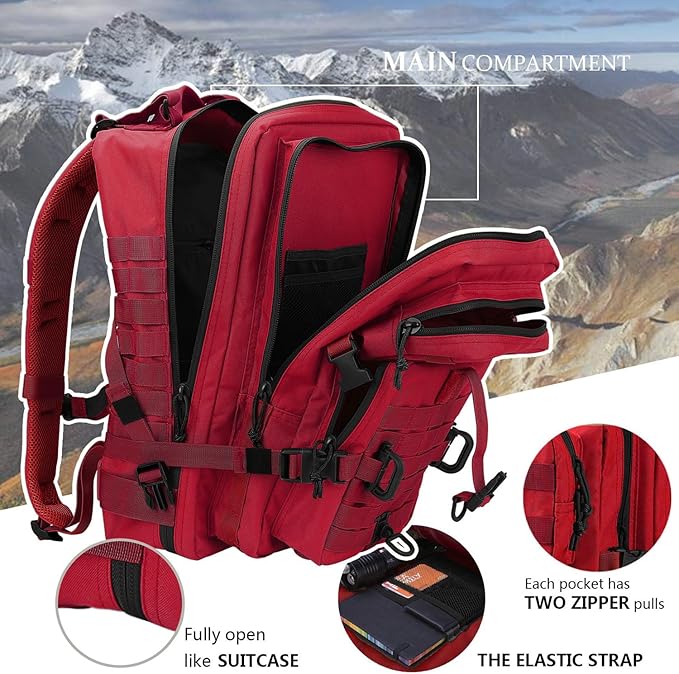 • MULTI-FUNCTIONAL - This tactical assault pack have 2 main compartments, 2 small compartments in front, and a back compartment for a hydration bladder. Each of the compartments has variety pockets to help with organization. The large compartment area has an elastic strap to hold laptops or anything you don't want to move around. Each pocket has two zipper pulls, and one of the compartments that can fully open all the way down to the bottom like suitcase.