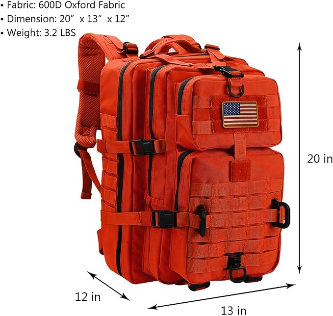• LARGE CAPACITY - Military tactical backpack size approx.:12"*20"*13" / 30*50*33CM (W*H*D) Capacity:40L, This tactical military assault backpack is made of quality and water-resistant High Density fabric, With Large Capacity allow you to carry all your tactical gears, it can be used as 3 day assault pack, bug out bag backpack, emergency backpack, combat backpack, range bag, molle emt backpack, EDC outdoor backpack, hunting backpack, travel backpack, survival backpack or trekking backpack