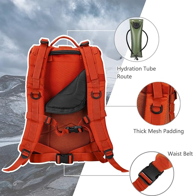 • COMFORTABLE & TOUGH - The shoulder straps are padded and adjustable and the waist belt expands enough. The thick mesh padding back area and shoulder straps will not pinch you under heavy duty. Thick padded back panel pocket works great with 3L hydration bladder(hydration bladder do not include)