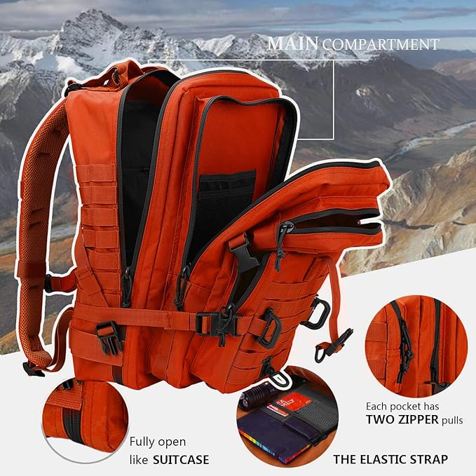 • MULTI-FUNCTIONAL - This tactical assault pack have 2 main compartments, 2 small compartments in front, and a back compartment for a hydration bladder. Each of the compartments has variety pockets to help with organization. The large compartment area has an elastic strap to hold laptops or anything you don't want to move around. Each pocket has two zipper pulls, and one of the compartments that can fully open all the way down to the bottom like suitcase.
