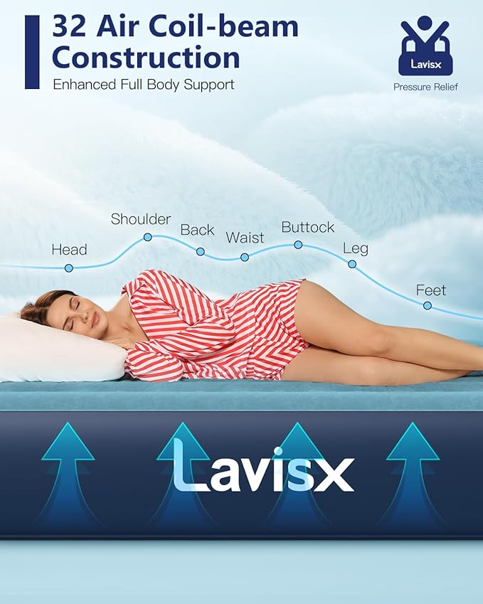 • Advanced Support System - Featuring an innovative coil structure, our inflatable mattress delivers superior support and comfort. The carefully designed 32-coil system, allowing you to sleep more naturally and wake up refreshed.