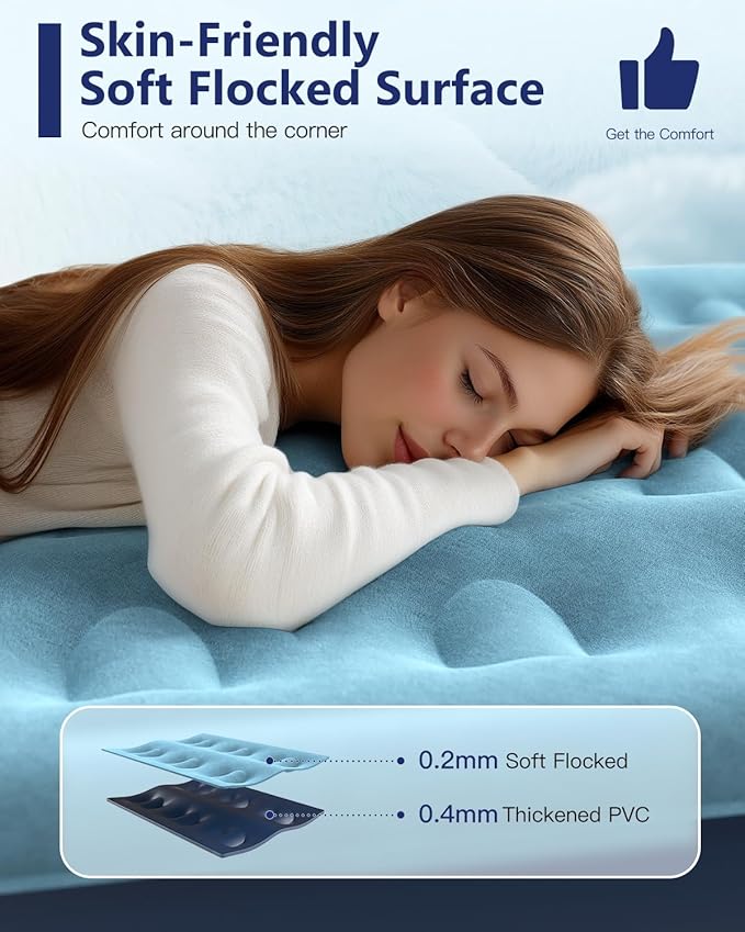 • Luxury Soft Touch - Crafted from premium flocked material, the surface of our air mattress is gentle on the skin. With its waterproof and stain-resistant properties, this air bed combines durability with comfort for a restful night's sleep.