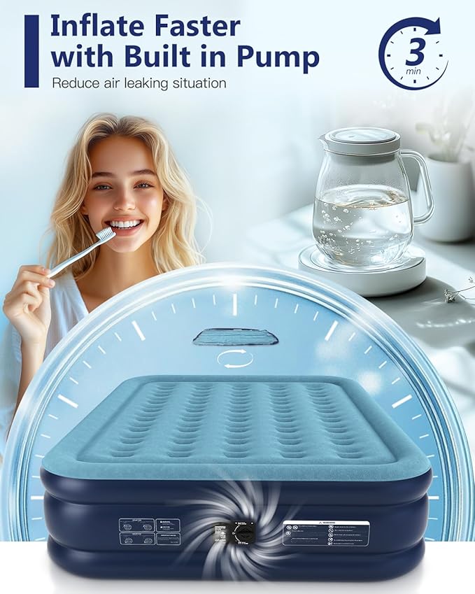 • Quick Inflate Technology - Enjoy effortless setup with our advanced queen air mattress raised featuring a 110V built-in pump that inflates and deflates in just 3 minutes. Say goodbye to manual pumping ensuring a seamless experience.