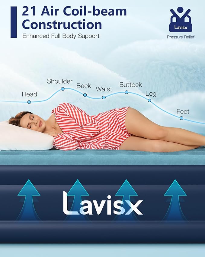 • Advanced Support System - Featuring an innovative coil structure, our inflatable mattress delivers superior support and comfort. The carefully designed 21-coil system, allowing you to sleep more naturally and wake up refreshed.