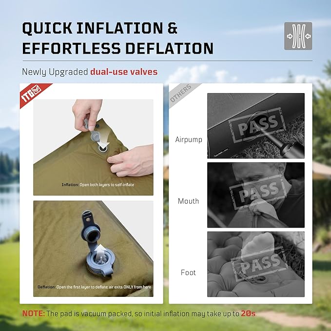 • Easy to Inflate and Deflate: Featuring a dual valve system and highly resilient foam, just open both valves for quick self-inflation and deflation—no need to use your mouth, hands, or a pump. When packing up, roll it with the elastic bands and store it in the included bag for easy transport, making it ideal for backpacking or car camping. 𝑵𝒐𝒕𝒆: 𝑫𝒖𝒆 𝒕𝒐 𝒗𝒂𝒄𝒖𝒖𝒎 𝒑𝒂𝒄𝒌𝒂𝒈𝒊𝒏𝒈, 𝒖𝒔𝒆 𝒚𝒐𝒖𝒓 𝒎𝒐𝒖𝒕𝒉 𝒐𝒓 𝒂 𝒑𝒖𝒎𝒑 𝒕𝒐 𝒊𝒏𝒇𝒍𝒂𝒕𝒆 𝒕𝒉𝒆 𝒔𝒑𝒐𝒏𝒈𝒆 𝒇𝒐𝒓 𝒕𝒉𝒆 𝒇𝒊𝒓𝒔𝒕 𝒕𝒊𝒎𝒆