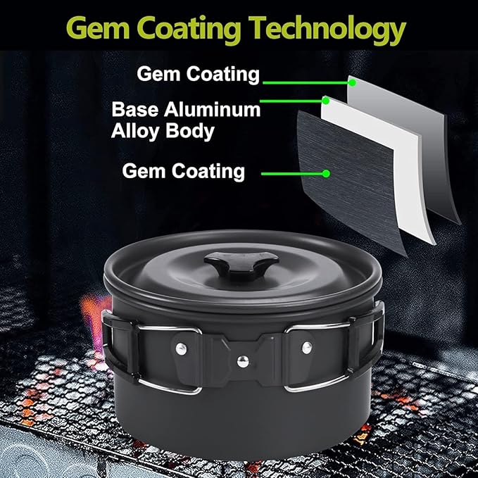 • DURABLE AND SAFE MATERIAL - This camping cookware set is made of food-grade aluminum alloy and includes a camping pot, a camping pan, a bamboo spoon, a cleaning sponge, cutlery, 3 plastic bowls, and a portable nylon set bag. The camping cookware can be nested together, is lightweight, non-toxic, has fast heat conduction, and is wear-resistant and corrosion-resistant.