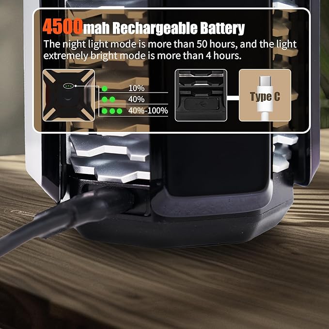 • 50-Hour Runtime on Single Charge: Never worry about darkness on your weekend camping trip! The powerful 4500mAh rechargeable battery lasts your entire outdoor adventure. Quick-charge via USB-C with your power bank, car charger, or solar panel. Say goodbye to disposable batteries and reduce your environmental footprint