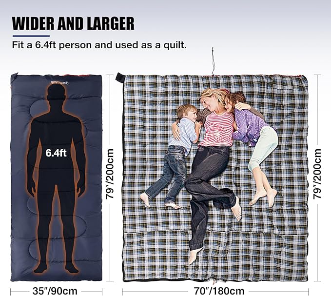 • Ultimate Warmth for Cold Weather: This flannel sleeping bag is designed for temperatures ranging from 10-25℉, featuring a thick 6 lbs of short cotton filling that ensures you stay warm during chilly nights while camping or for outdoor adventures.
