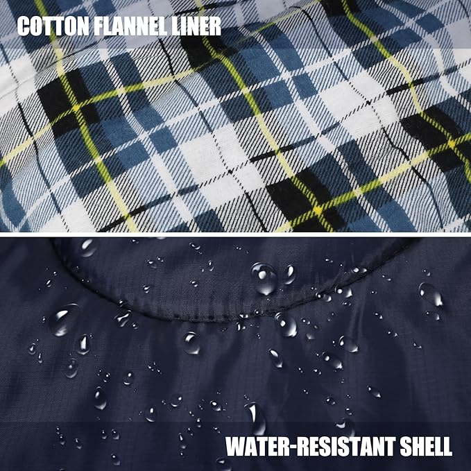 • Premium Quality Materials: Crafted with a 210T polyester waterproof shell, 100% cotton flannel lining, and soft fill, this camping sleeping bag offers exceptional comfort and protection against moisture and the elements.
