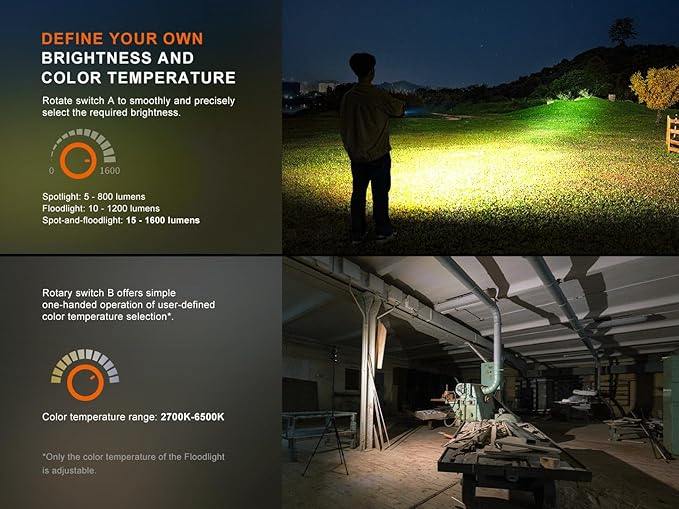 • VERSATILE MODES AND TEMPERATURE - A rotary toggle and an electronic switch grant easy access to eight white light modes and two red light modes. Another rotary toggle can adjust the color temperature of the floodlight.