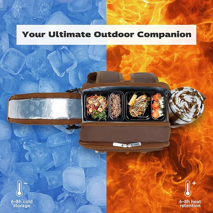 • LARGE CAPACITY & WELL EQUIPPED: Size: 12(L)x7.5(W)x15(H) inches, 5.2 lb; The 22L high-capacity picnic backpack big enough to accommodate the ingredients needed for a picnic. Includes a full set of camping accessories: backpack cooler, picnic blanket, wine bag, cutlery and cutting board, etc. The camping backpack bag is made of 100% polyester fabric and 5mm PE foam and PU layer, which can keep the hot/cold/fresh for hours.