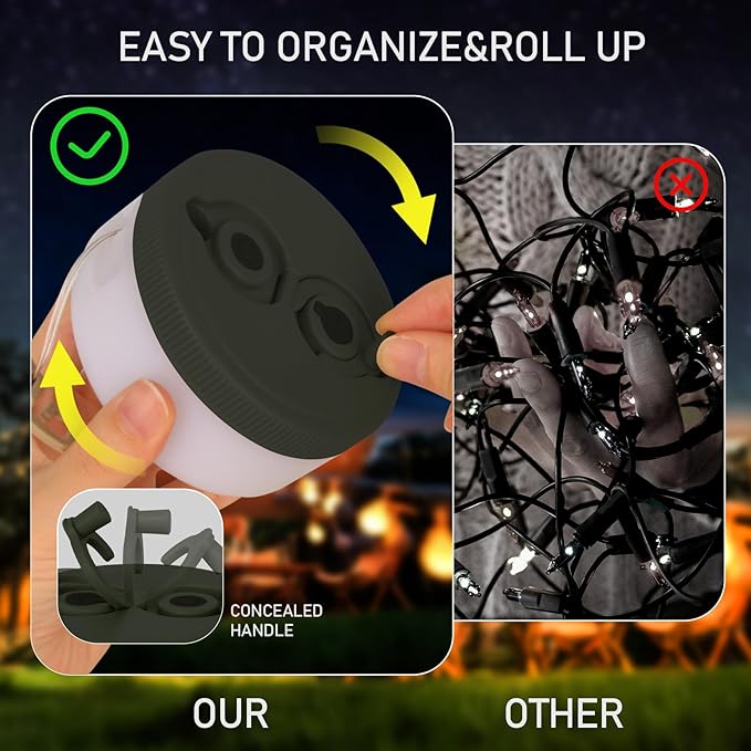 • Portable and Convenient: Geisofu Warm lighting camping lights string are very convenient to carry and use outdoors. Portable camping lantern outdoor weighs only 0.45 pounds and the light string is pulled out to 26.2ft with two storage options: rotating bottom storage and rotating hook storage. Hidden hooks allow you to hang them in the tent, and stowable camping string lights outdoor provide flexibility and convenience for any outdoor adventure.