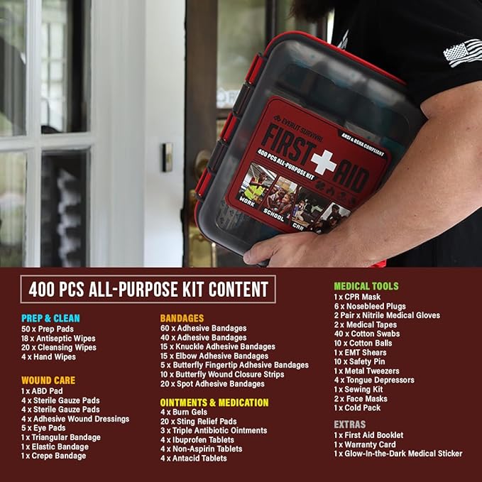 • ✅Exceeds OSHA/ANSI Standards: Contains 400 pieces of essential medical supplies, fully compliant with and exceeding ANSI Z308.1-2009 standards for workplaces with up to 100 people.