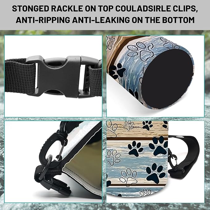 • Adjustable Carrying Options: Available in 5L and 10L with a removable shoulder strap for cross-body carry, or a 20L version featuring two adjustable straps for backpack-style comfort.Roll-top closure system provides secure watertight seal, keep your gear dry in any wet situation.Unique Black Cartoon Dog Pawprints Blue Brown design dry bag backpack Carry it your way!