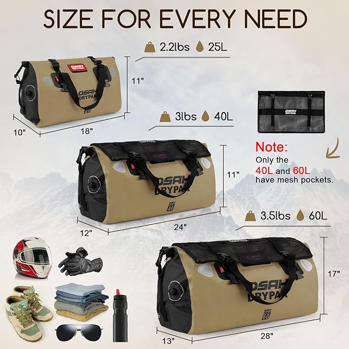 • VERSATILE SIZES & COLORS: Available in three sizes (25L, 40L, and 60L) to suit different activities, whether it’s a quick day trip or a longer expedition. Plus, our variety of color options lets you express your individuality and stand out in any crowd.