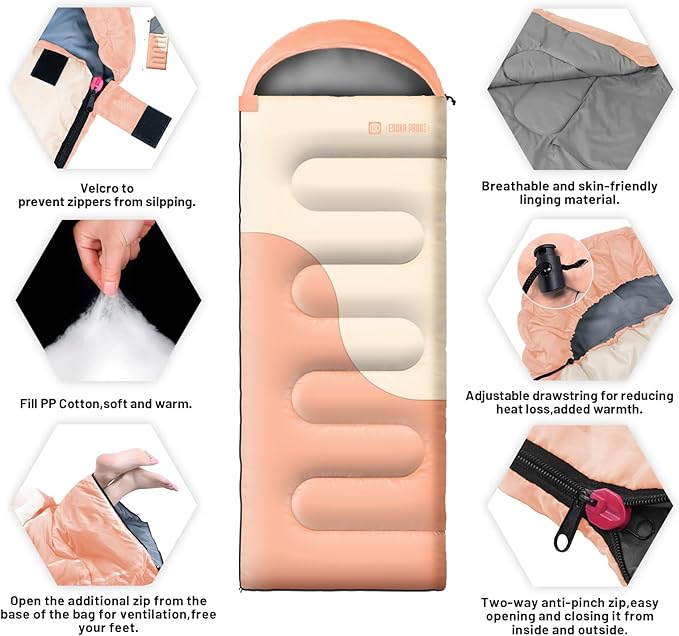 • Comfortable Sleeping Experience:Our sleeping bag can be used in 3 seasons with a design optimal comfort temperature of 59℉,,temp rating 50°F,imit 41°F.This lightweight sleeping bag is perfect for weather camping trips in Spring through to Autumn.Give you a comfortable sleep after a day of adventure outdoor camping, backpacking, hiking, and outdoor travel.