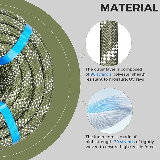• High Strength: This arborist rigging Rope is composed of 96 strands polyester sheath and high strength 70 strands of tightly woven nylon inner core, resistant to moisture, UV rays, chemicals, and aging, this climbing rope maintains its integrity over time.