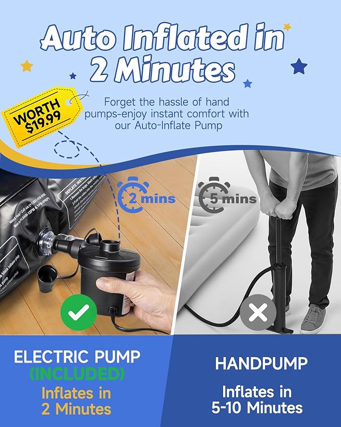 • Inflates in Just 2 Mins! : Inflatable toddler bed comes with an electric pump for ultra-fast inflation and deflation. No more hassle with manual pumps—save time and energy while giving your child instant comfort. Whether you're at home or on the go, kids air mattress sets up and packs away in just minutes—faster than brushing teeth! Inflated size: 81" x 45" x 13" (standard twin size)