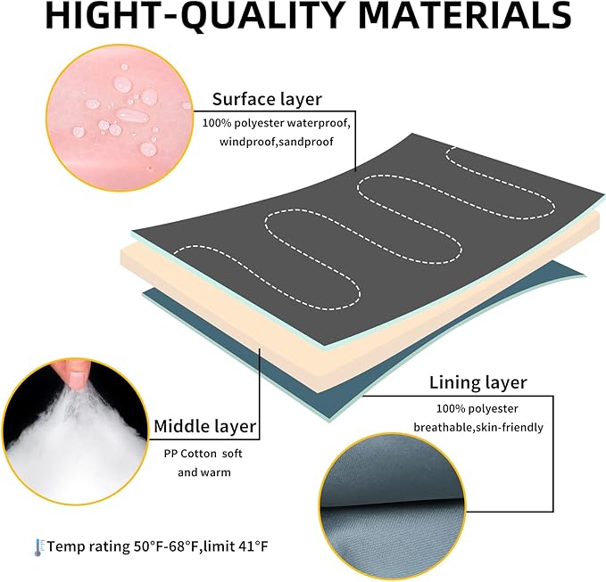 • Comfortable Sleeping Experience:Our sleeping bag can be used in 3 seasons with a design optimal comfort temperature of 59℉,temp rating 50°F-68°F.This lightweight sleeping bag is perfect for weather camping trips in Spring through to Autumn.Give you a comfortable sleep after a day of adventure outdoor camping, backpacking, hiking, and outdoor travel.