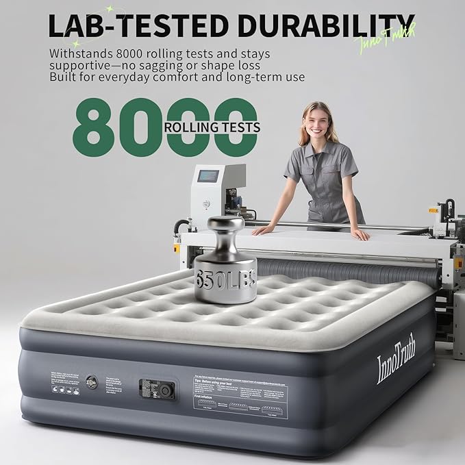 • ๐”๐ง๐ซ๐ข๐ฏ๐š๐ฅ๐ž๐ ๐‚๐จ๐ฆ๐Ÿ๐จ๐ซ๐ญ: Enjoy quick, firm support with the InnoTruth air mattress, featuring a powerful 110V pump that inflates or deflates in just 3 minutes. The Smart Air Coil System conforms to your body's natural curves, evenly distrubuting weight to minimize sinking and relieve pressure on your back
