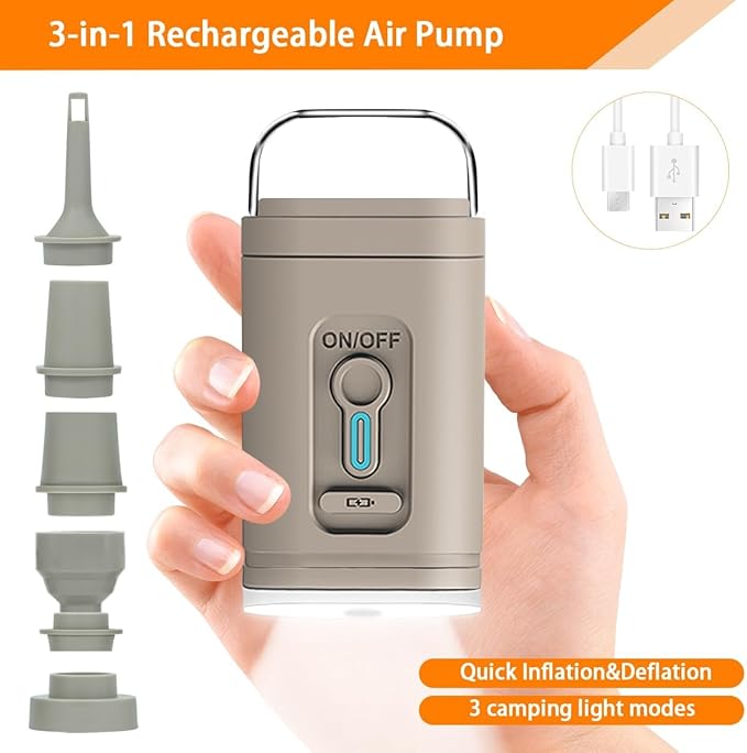 • Rechargeable Air Pump: Many customers prefer fuller mattresses, so we offer a rechargeable air pump (optional) for improved inflation and storage. It boasts a built-in battery for up to 20 uses per charge, facilitating effortless inflation/deflation. With one-button operation, it inflates/deflates in under 1 minute and includes 5 nozzles for various products like air mattresses and swimming pools. Additionally, it features a camping light mode with adjustable brightness (up to 10 hours on low).