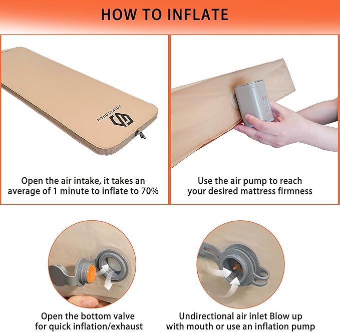 • Inflatable Camping Mattress: Our self-inflating mattress can be quickly inflated by simply opening the valve, offering easy operation and effective sealing. Once the valve is fully opened, the sleeping mat will self-inflate by up to 70% within 60 seconds.