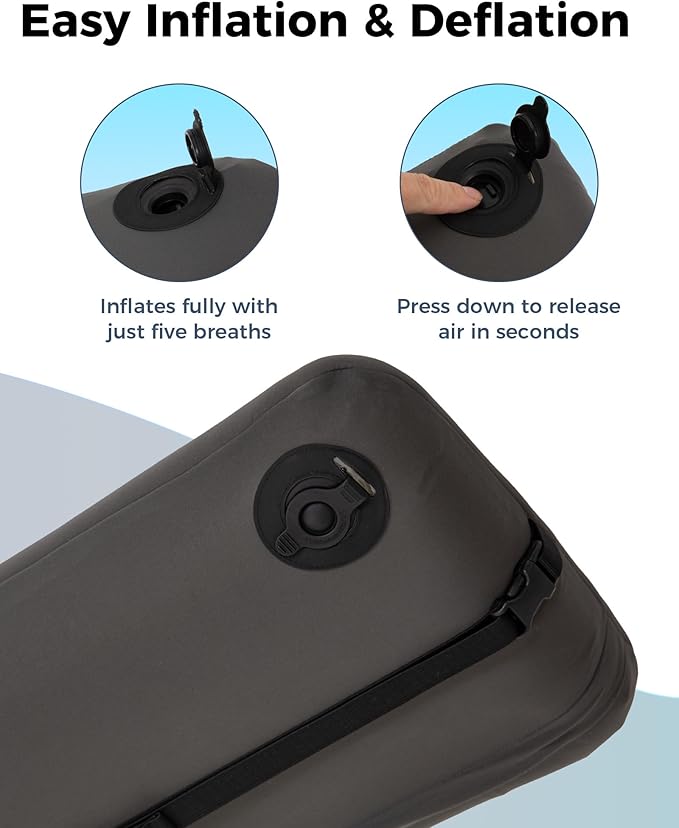 • QUICK INFLATION & EASY PACKING WITH DUAL-ACTION VALVE: Our inflatable camping pillow comes with a dual-purpose valve for quick inflation and deflation. Inflate in seconds with a few breaths, adjust the firmness to your preference, and pack it down small when you’re done. Its compact size makes it easy to store in any travel bag or backpack, ideal for lightweight camping or hiking expeditions.