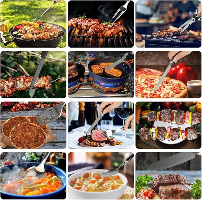 • Premium Quality Materials: Crafted from food-grade stainless steel, our utensils are designed for durability and reliability. They’re dishwasher safe for easy cleanup, making meal prep a breeze whether at the campsite or home.