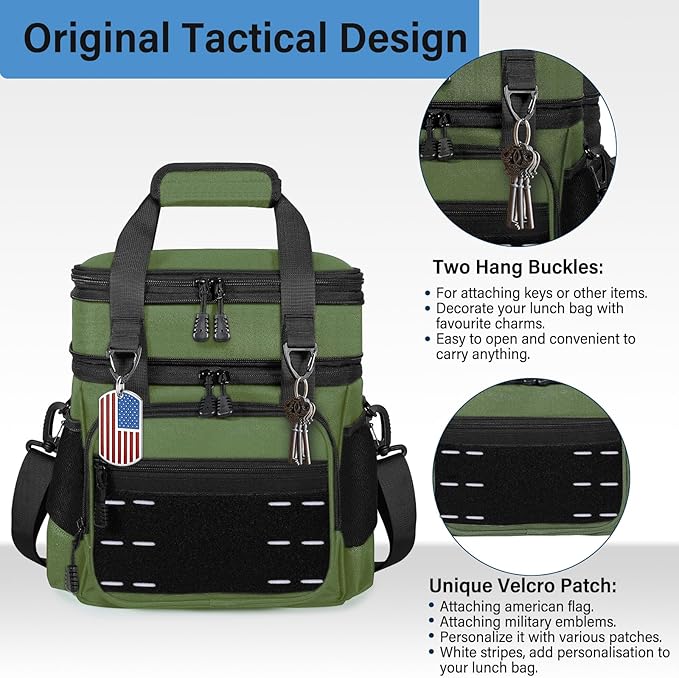 • Unique Tactical Style: With a large Velcro Patch on the side and front pockets, you can customize the lunch box with american flag to showcase your national pride, adding a touch of personality to the lunch cooler. You also can added various patches, to cater to your wide range of needs and preferences. Two Hang buckles for attaching keys or other items.