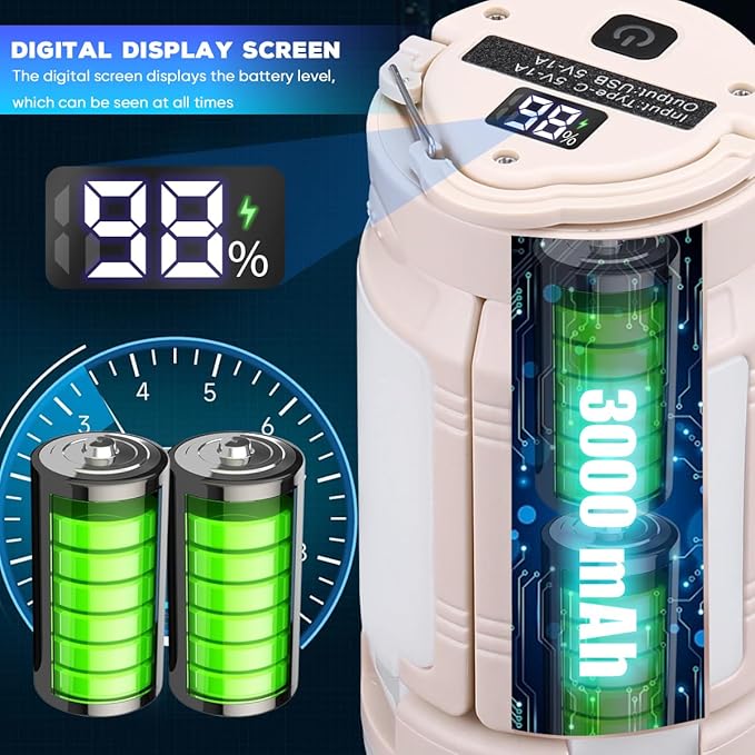 • Fast Charging & Power Digital Display: Equipped with a Type-C charging cable, this lantern charges fully in just 2.5 hours using any USB port. The built-in LCD power display shows the remaining b-a-t-t-e-ry life, so you always know when to recharge. Plus, it can charge your phone via the output port, making it a reliable power source on the go