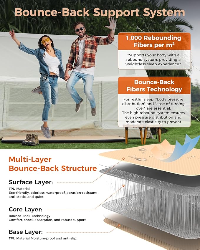 • CUSTOMIZABLE FIRMNESS & HIGH-BOUNCE SUPPORT: Not your average inflatable mat—adjust firmness for soft, medium, or firm support. This high-resilience camping mat allows you to jump on it without losing its shape or support. Sit, sleep, or even jump with cloud-like comfort, making it a great alternative to bulky foam sleeping mats or thin air pads.