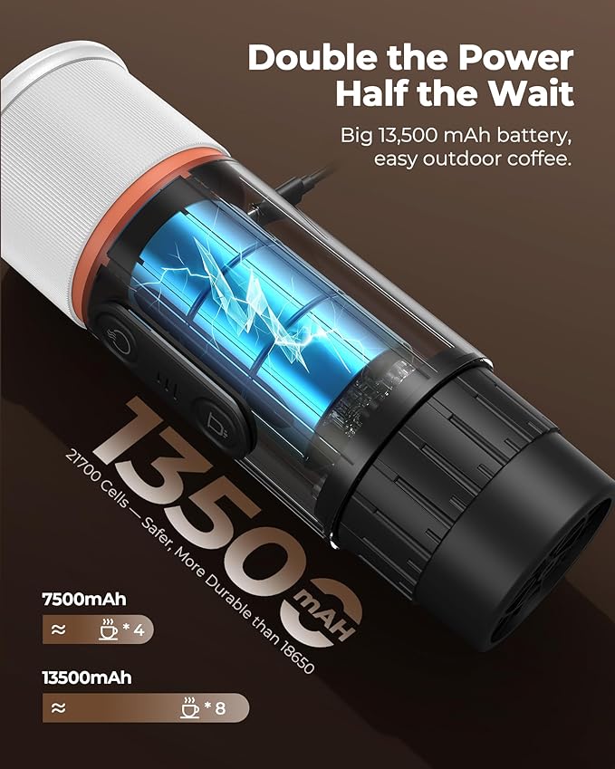 • 13500mAh XL BATTERY & BIG SAVINGS: Twice the power of 7000mAh rivals, it brews 8‑10×40mL shots or keeps lattes and iced coffee hot all afternoon, cutting a $5‑a‑day coffee habit to pennies—paying for itself in 3 weeks on road trips, hikes and tailgate parties.