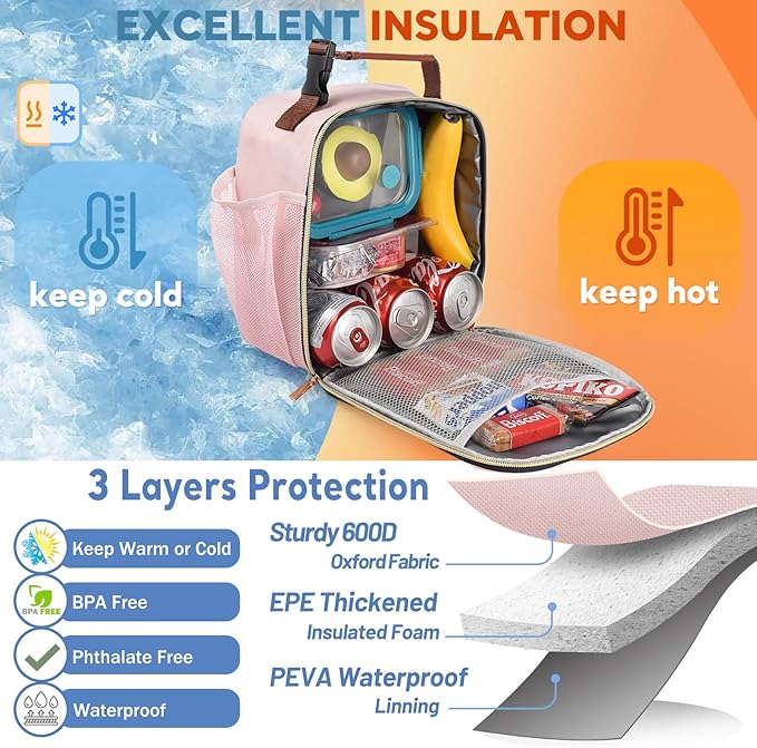 • Additional Pocket: The mesh pockets on the side of the insulated lunch bags for women and lunch bag for kids can hold an umbrella and a water bottle, and the zippered pocket on the front can hold a cell phone,cutlery, napkins, keys and other small items.The dual smooth zippers is easy to open or close