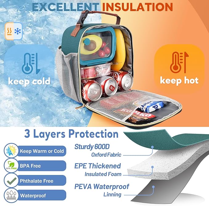 • Additional Pocket: The mesh pockets on the side of the insulated lunch bags for women and lunch bag for kids can hold an umbrella and a water bottle, and the zippered pocket on the front can hold a cell phone,cutlery, napkins, keys and other small items.The dual smooth zippers is easy to open or close