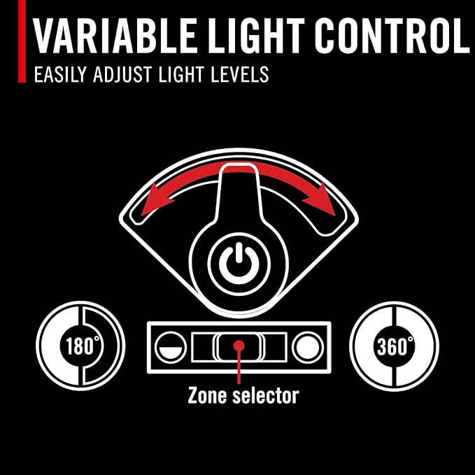 • DUAL ZONE LIGHTING: Switch between 360-degree lighting and 180-degree lighting in white mode with the flip of a switch.