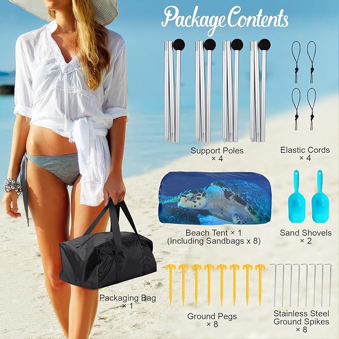 • 🔧【Quick and Easy Setup】It only takes a few minutes to set up and take down. Spread it out, then fill the sandbags, and add the poles. The included sand shovel is a nice bonus to fill 8 sandbags. Burying sandbags into the beach will make beach shelter more stable. One person can do it, making the outdoor beach day so easy and comfy!