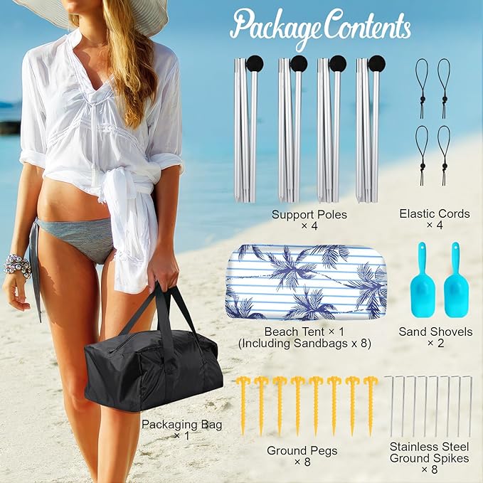 • 💨【Stands up to High Wind】Our upgraded beach tent sun shelter is equipped with 8 sandbags, 4 thickened aluminum poles and 4 windproof ropes, strong enough to withstand high beach winds, ensure stability and prevent collapse.