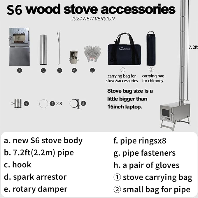 • DURABLE &EFFICIENT: 2024/10 NEW design S6 stove enhanced durability of top and side. Made of rust-resistant 304 stainless steel (0.6mm thickness) and 0.08mm thick pipe. Damper and door air intakes is easy to control the burning process, making it a reliable heating solution for 3m hot tent camping.