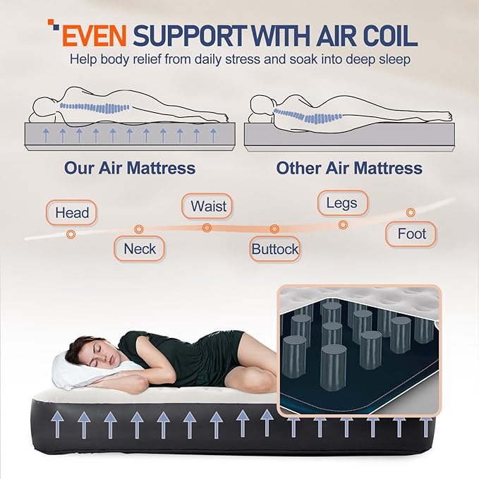 • Portable and Lightweight: Easily transportable, this air mattress comes with a carrying bag, making it perfect for camping trips, guest accommodations, or any situation where extra sleeping space is needed.
