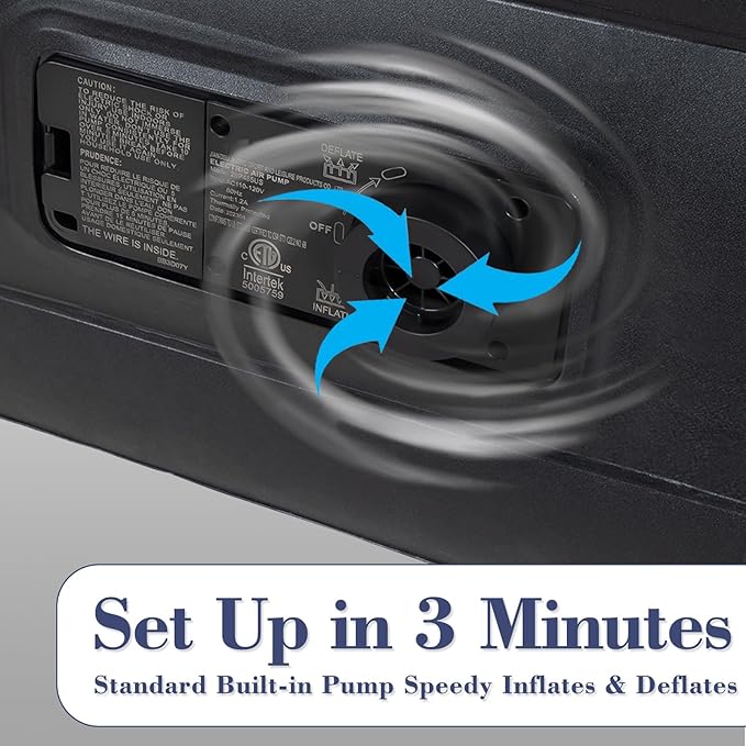 • Built-in Pump: With just a flip of a switch, the powerful pump quickly inflates or deflates the mattress in a matter of minutes, saving you time and effort.