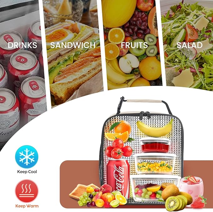 • 【Large Capacity Lunch box】The size of the insulated lunch bag: 9.3''L x 4.7''W x 10.2''H. It is spacious enough to accommodate your food, sandwiches, snacks, drinks, breads, and more. It will fulfil your meal needs for the entire day.